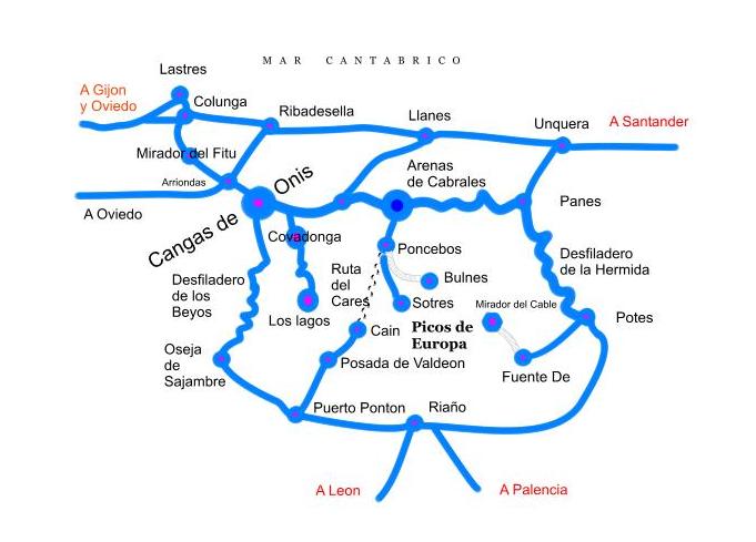 El plano que aparece en esta página es obra de Fran Berán. En su nueva versión incluye una espectacular novedad, pues pinchando en cualquier punto se pueden ver todas las calles y edificios de Cangas de Onís (solo en su web) . Además, Fran Berán ofrece otros mapas de la zona que son una auténtica gozada dentro de su web "Cangas de Onís por libre".Pulse para tener ACCESO A FRANBERAN.COM MAPAS DE VIAJE PARA PREPARAR EXCURSIONES Aquí tiene un mapa que indica las posibles excursiones en coche en dirección a Cantabria y por la costa. Las poblaciones más al sur aparecen de forma indicativa, ya que hay un mapa específico para los Picos de Europa. Vea cómo puede ir hasta Santander en el día en solo hora y cuarto o bien entretenerse en visitar todos los pueblos marineros o bien los múltiples atractivos de Cantabria desde Asturias. COSTA DE ASTURIAS Y CANTABRIA